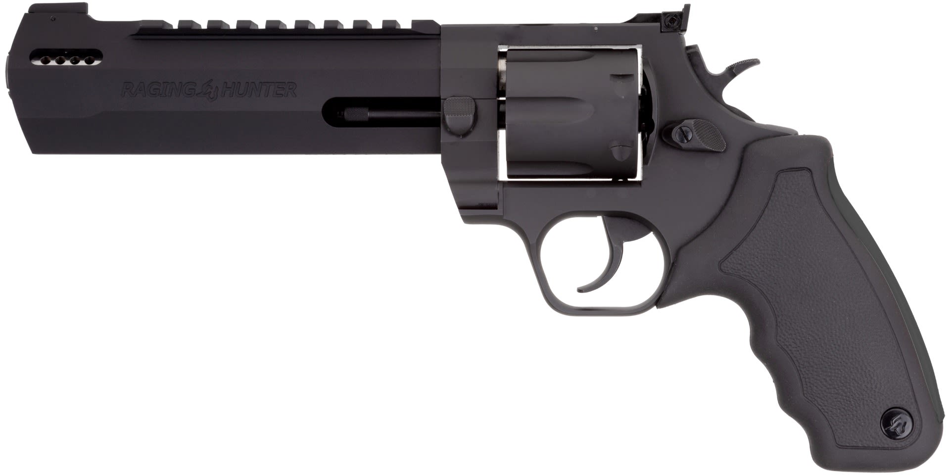 Winner of the 2019 American Hunter Handgun of the Year Golden Bullseye Award, the Taurus Raging Hunter is a next-generation, big-bore revolver that's first in innovation-and built to last. A fun and effective alternative for short- to medium-range hunting scenarios, this 44 Magnum, six-shot revolver is available in Matte Black or Two Tone finish. Its revolutionary angular barrel design cuts down on overall weight, while its factory tuned porting and gas expansion chamber reduces muzzle lift for quicker target acquisition. Cushioned insert grips ensure a comfortable, controllable shooting experience.