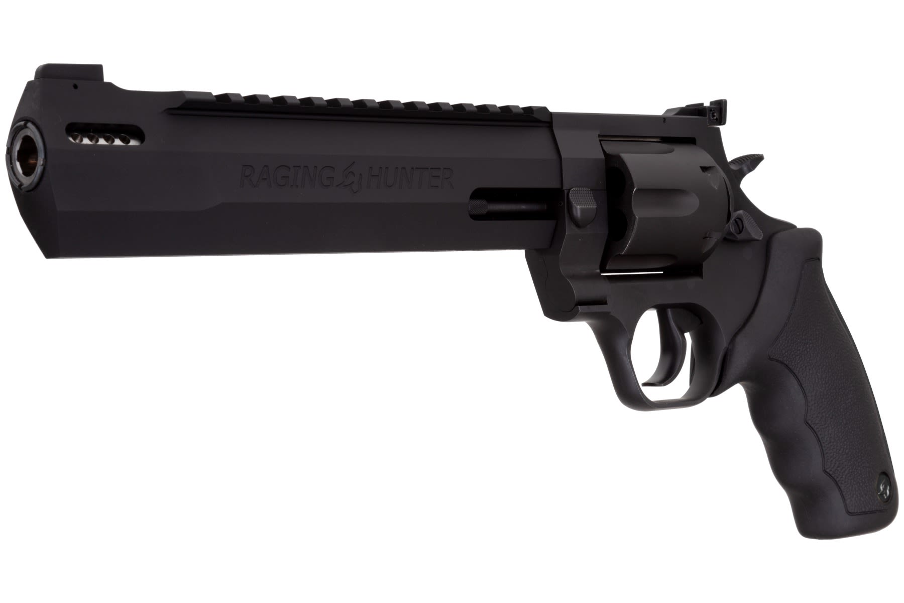 The Taurus Raging Hunter™ is a 44 Magnum, 6-shot revolver. Its striking Stainless and Blue two-tone finish is enough to grab the attention of any big-bore aficionado, but the optics-ready Picatinny rail and angular barrel design will seal the deal. It is also available in a Matte Blue for those seeking a more classic look. The unique barrel system incorporates a steel sleeve that is inserted into an aluminum housing that cuts down on the overall weight, making this a well-balanced hunting sidearm. The exclusive cushioned insert grips on the Raging Series large frame revolvers makes shooting them comfortable and controllable. Also aiding in recoil management is the unique placement of the factory-tuned porting and gas expansion chamber that is designed to disperse gases directionally—reducing muzzle lift and delivering quicker target acquisition. This built-to-last revolver is a fun and effective alternative for short to medium range hunting scenarios.