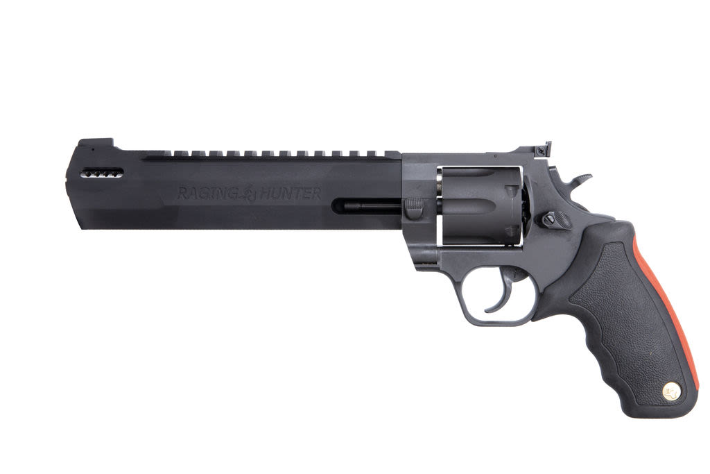 Winner of the 2019 American Hunter Handgun of the Year Golden Bullseye Award, the Taurus Raging Hunter is a next-generation, big-bore revolver that's first in innovation-and built to last. A fun and effective alternative for short- to medium-range hunting scenarios, this five-shot revolver is chambered in 454 Casull and is available in Matte Black or Two Tone finish. Its revolutionary angular barrel design cuts down on overall weight, while its factory tuned porting and gas expansion chamber reduces muzzle lift for quicker target acquisition. Cushioned insert grips ensure a comfortable, controllable shooting experience.