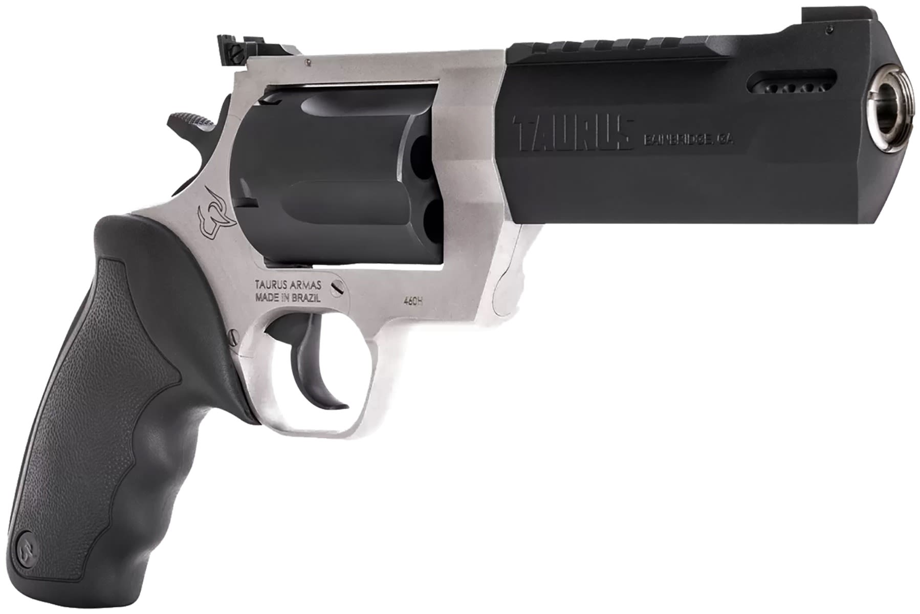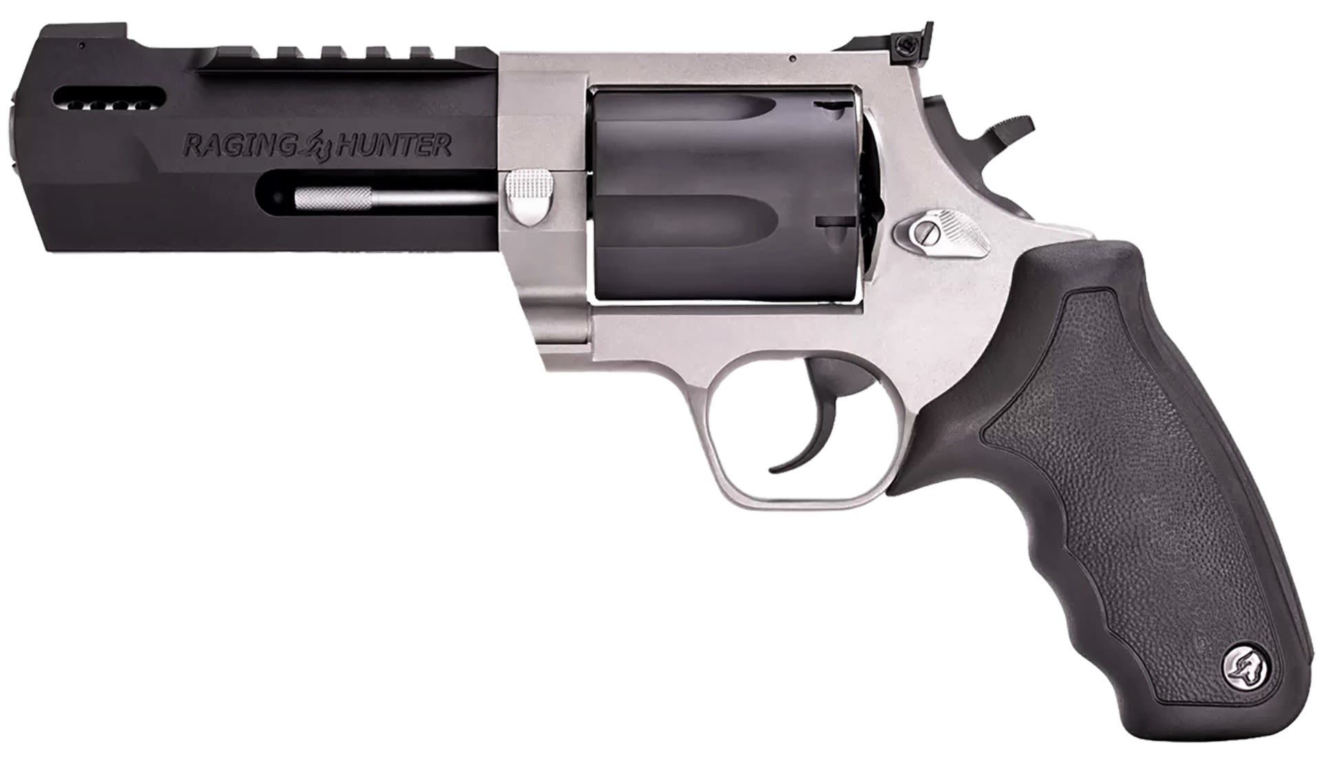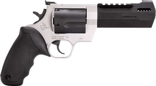 Winner of the 2019 American Hunter Handgun of the Year Golden Bullseye Award, the Taurus Raging Hunter is a next-generation, big-bore revolver that's first in innovation-and built to last. A fun and effective alternative for short- to medium-range hunting scenarios, this five-shot revolver is chambered in 460 S&W Magnum and is available in Matte Black or Two Tone finish. Its revolutionary angular barrel design cuts down on overall weight, while its factory tuned porting and gas expansion chamber reduces muzzle lift for quicker target acquisition. Cushioned insert grips ensure a comfortable, controllable shooting experience.