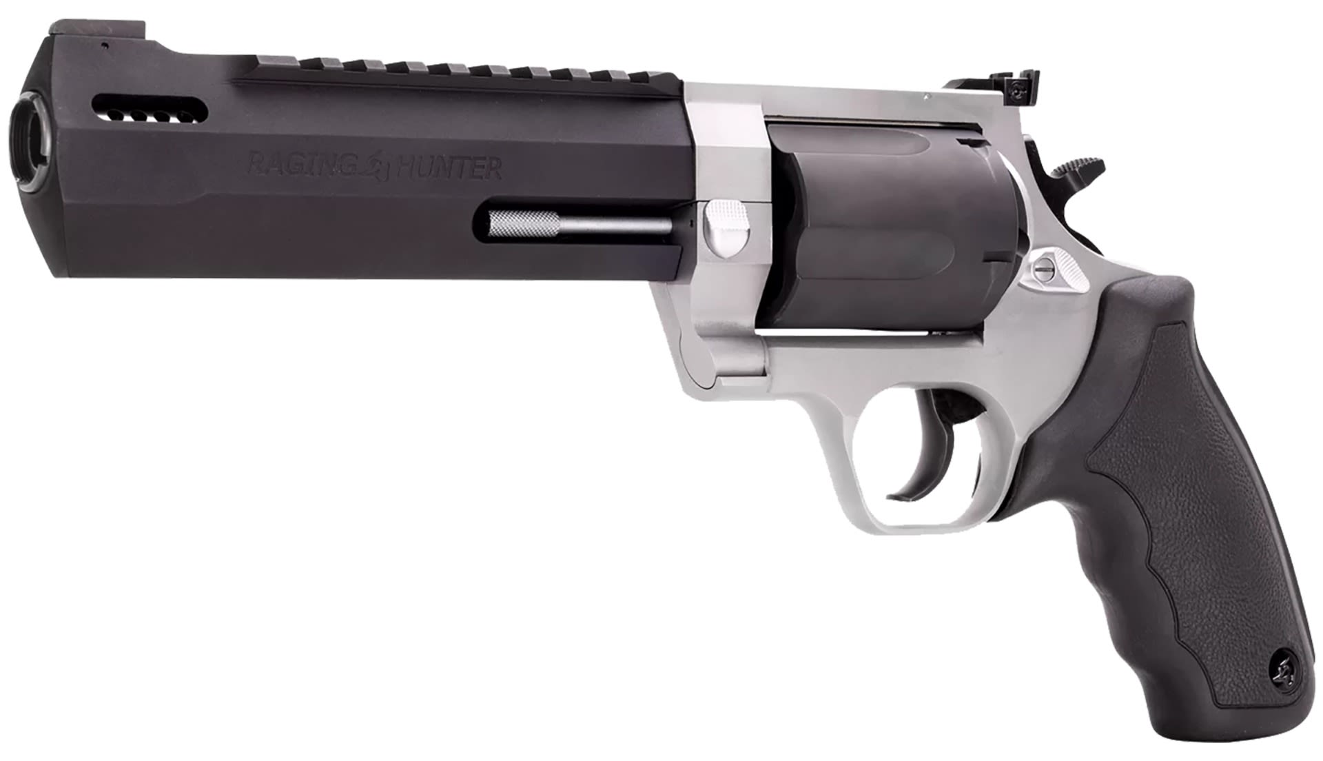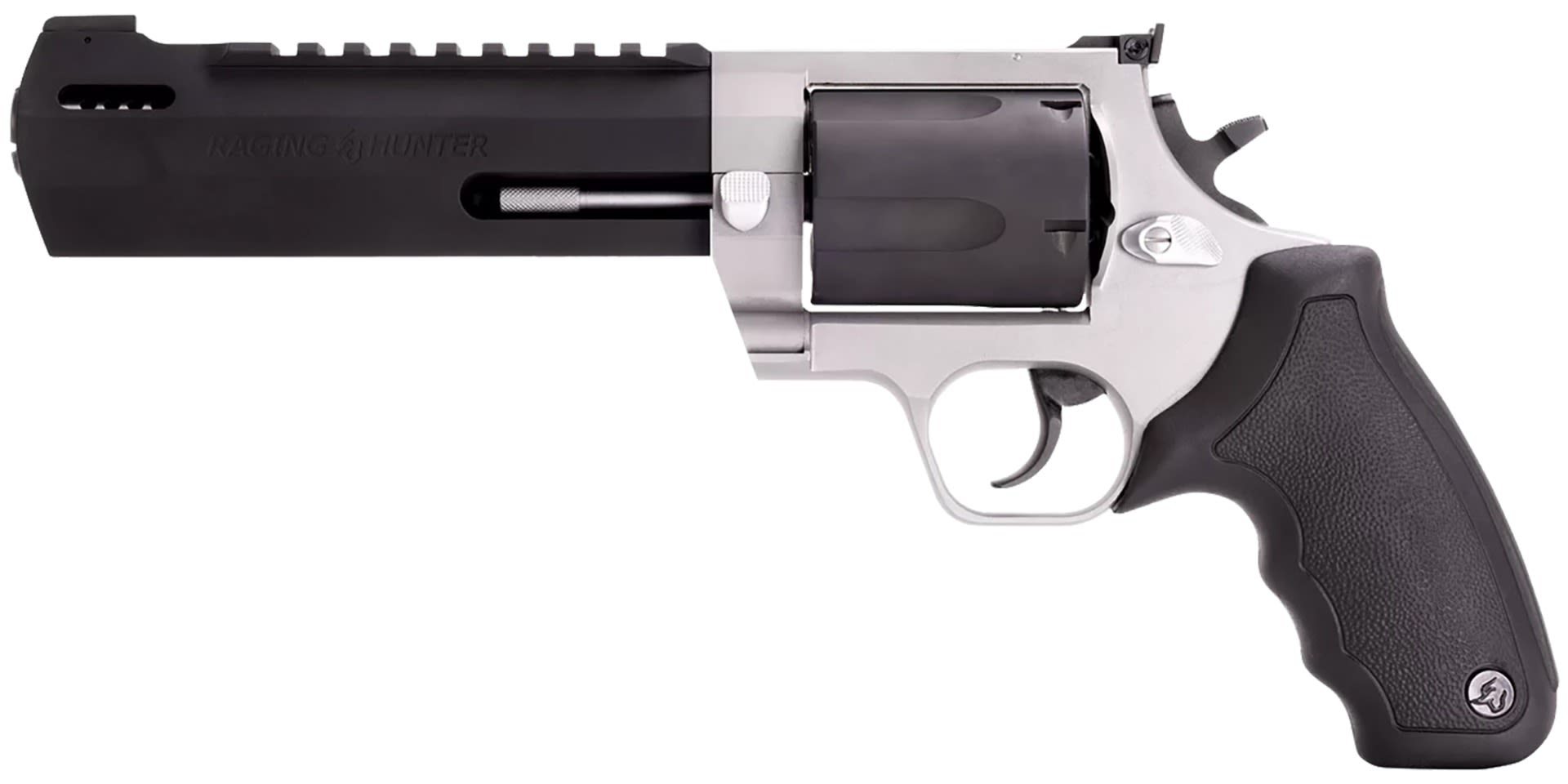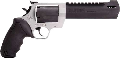 Winner of the 2019 American Hunter Handgun of the Year Golden Bullseye Award, the Taurus Raging Hunter is a next-generation, big-bore revolver that's first in innovation-and built to last. A fun and effective alternative for short- to medium-range hunting scenarios, this five-shot revolver is chambered in 460 S&W Magnum and is available in Matte Black or Two Tone finish. Its revolutionary angular barrel design cuts down on overall weight, while its factory tuned porting and gas expansion chamber reduces muzzle lift for quicker target acquisition. Cushioned insert grips ensure a comfortable, controllable shooting experience.