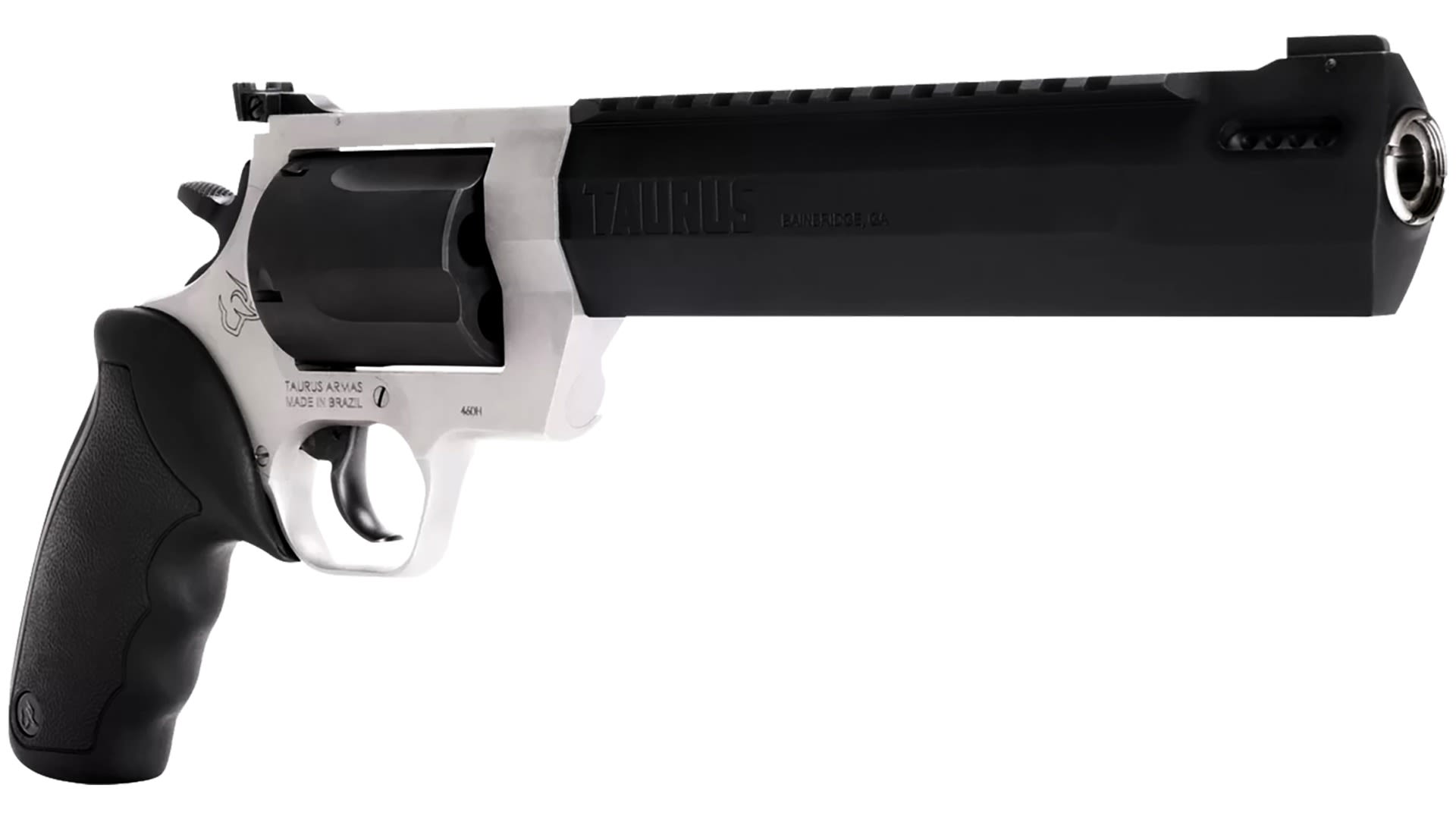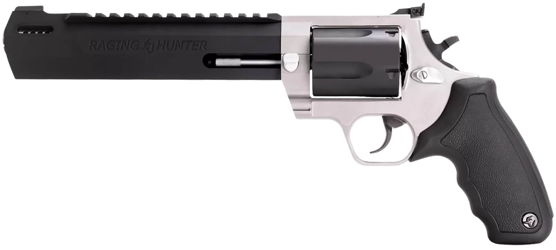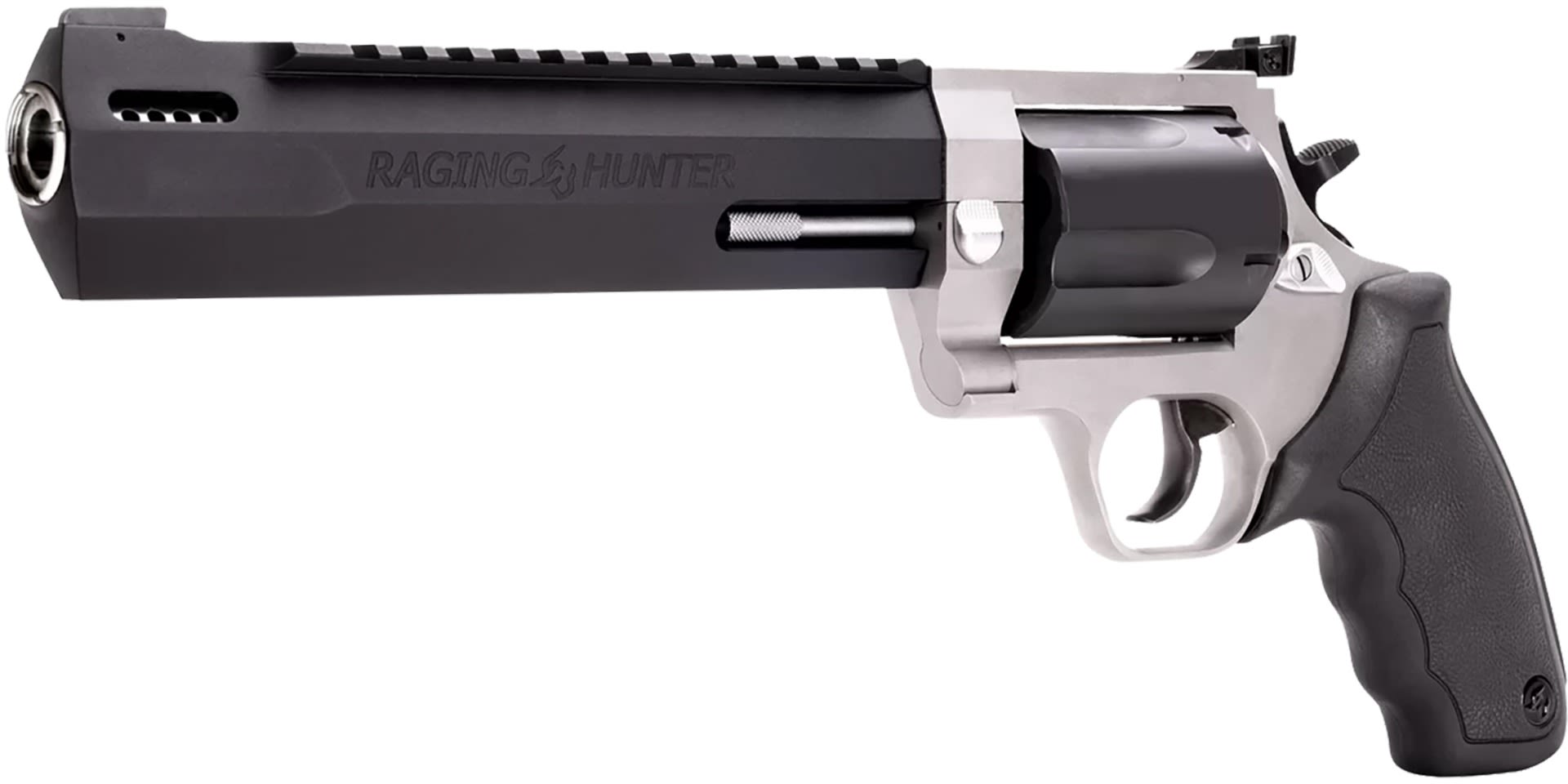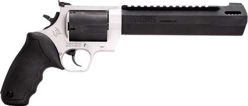 Winner of the 2019 American Hunter Handgun of the Year Golden Bullseye Award, the Taurus Raging Hunter is a next-generation, big-bore revolver that's first in innovation-and built to last. A fun and effective alternative for short- to medium-range hunting scenarios, this five-shot revolver is chambered in 460 S&W Magnum and is available in Matte Black or Two Tone finish. Its revolutionary angular barrel design cuts down on overall weight, while its factory tuned porting and gas expansion chamber reduces muzzle lift for quicker target acquisition. Cushioned insert grips ensure a comfortable, controllable shooting experience.