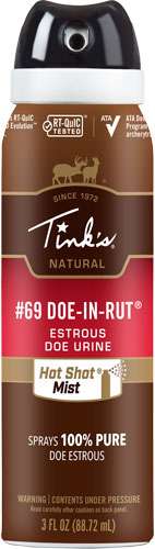 Tink's #69 Doe-In-Rut Buck Lure is 100 percent natural doe estrous urine collected from live whitetail does during their estrous cycle. The Hot Shot Mist Bag-in-Can Technology separates the urine from the pressurizing agent for ZERO contamination. This system allows the entire product to be dispensed and sprays longer than traditional spray cans.