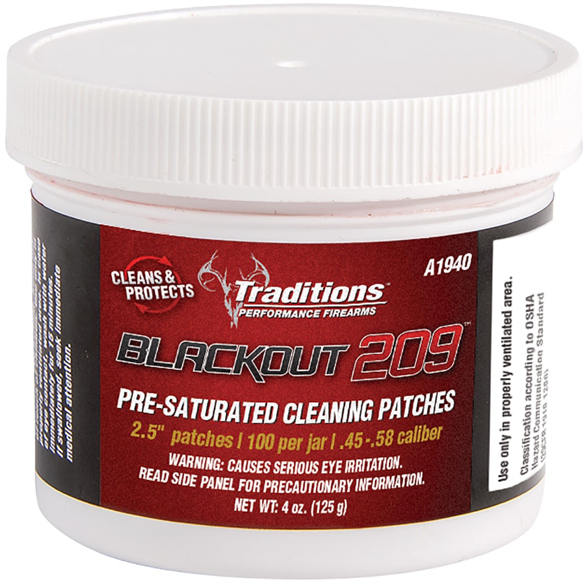 Easy to use and carry! These patches have an all-in-one oil-based cleaner which reduces fouling and treats the barrel to help protect against rust when using Blackhorn 209 powder. 2.5'' round patches, 100 per jar. For .45-.54 caliber.