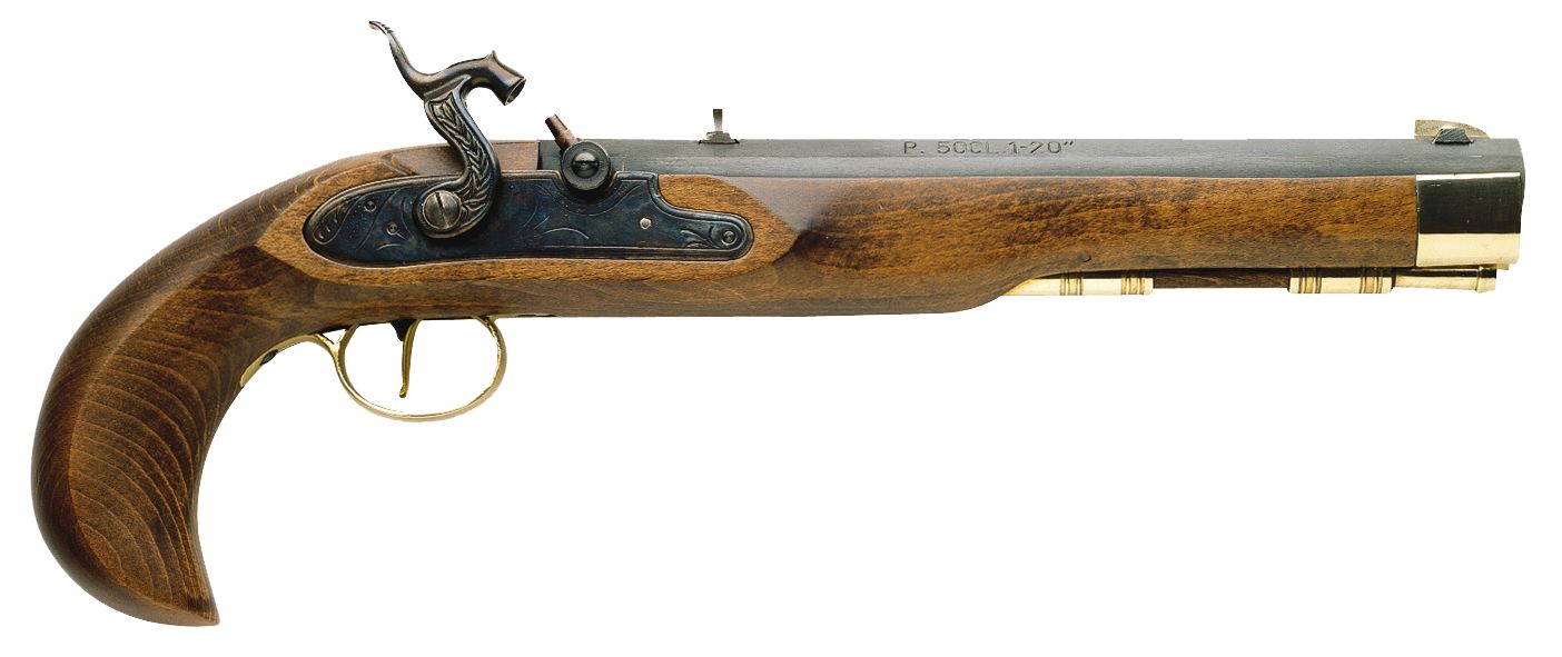A classic American pistol, the Kentucky was a must have for American Pioneers and early 19th Century Explorers. The Kentucky was made famous by the battle of New Orleans and favored by Davey Crockett. It was a favorite because of its one piece stock with superb balance and features like a birds head grip, fixed sight, case colored sidelock and brass ramrod thimbles. The Kentucky will please both the collector and novice alike. Whether you are a die hard or just a weekend enthusiast your fully functional Kentucky will meet your needs.