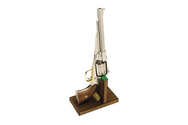 A good looking and convenient way to display and load your cap and ball revolver. Pistol grip rests securely in wooden base while felt-lined wooden upright support back strap securely. Positions cylinder to rotate and face upward for easy loading. Loading stand collapses for easy storage. Fits 1851, 1860 and 1858 revolvers.