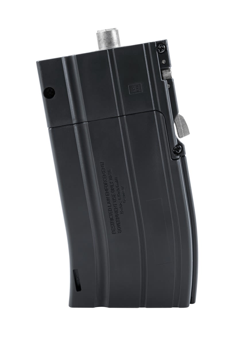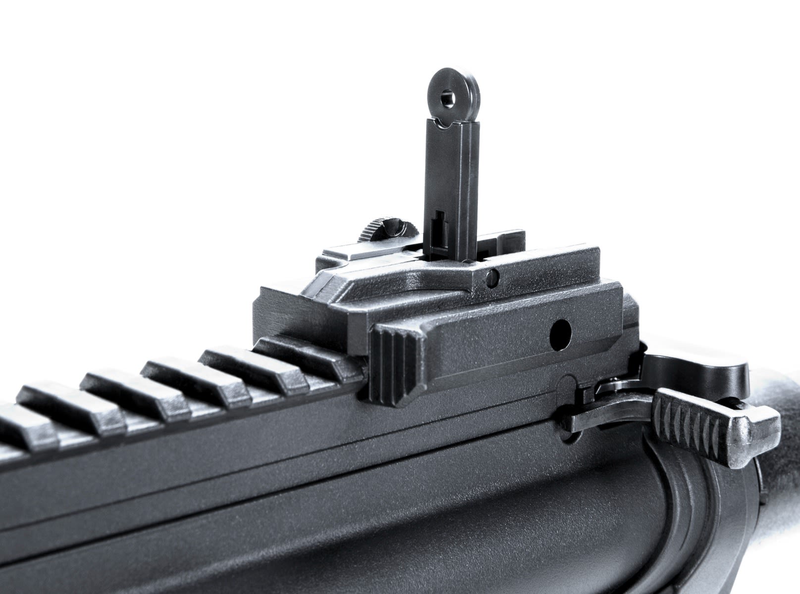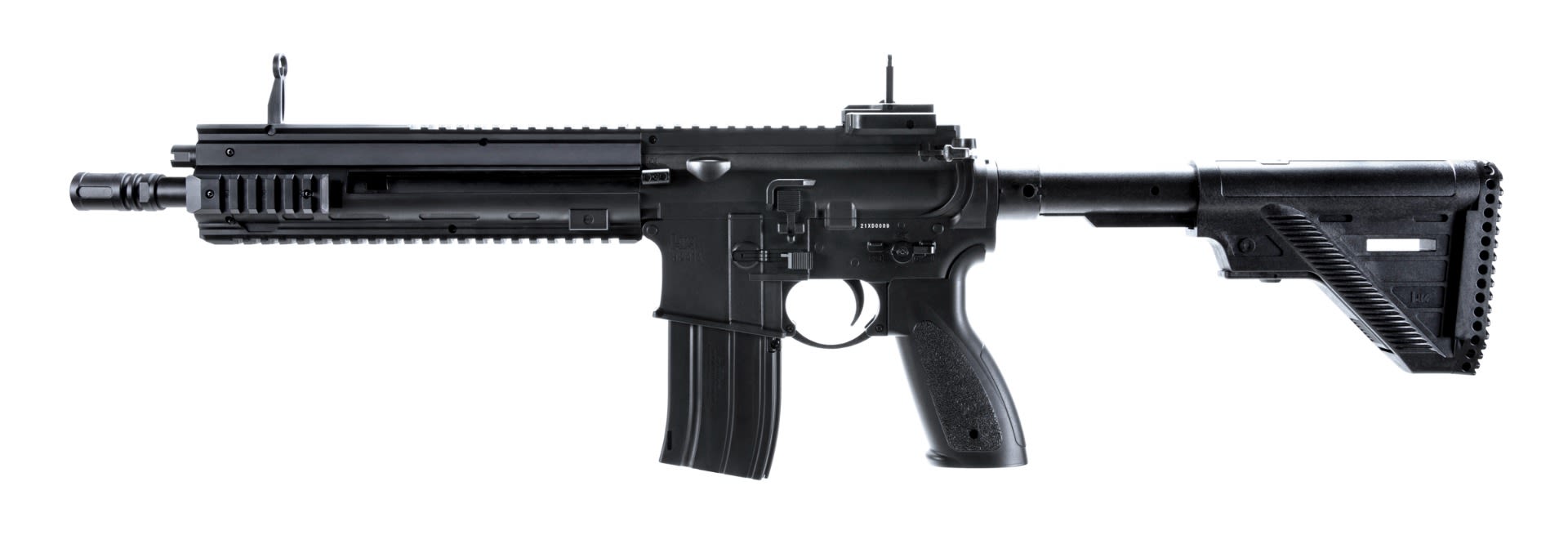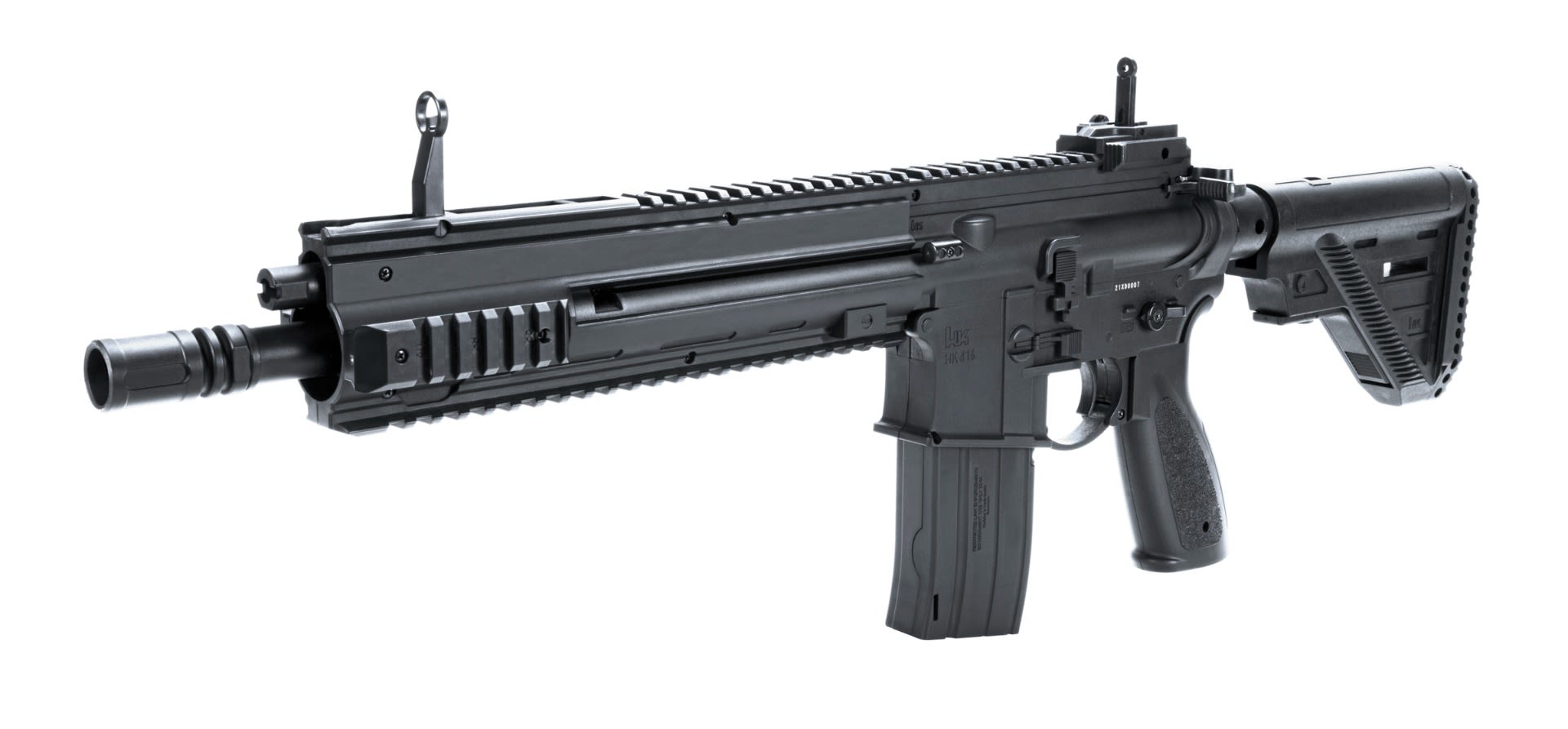 Bring your BB plinking game up a level with the HK 416 .177 caliber BB carbine. This officially licensed BB blaster is powered by easy-to-find 12 gram CO2 and has a drop-free magazine that holds 500 BBs in its main reservoir and 36 BBs in the feeding portion. Reloads are fast and CO2 changes are very easy with this system. The HK 416 BB carbine is loaded with plenty of Picatinny Rails for the attachment of optics and accessories.