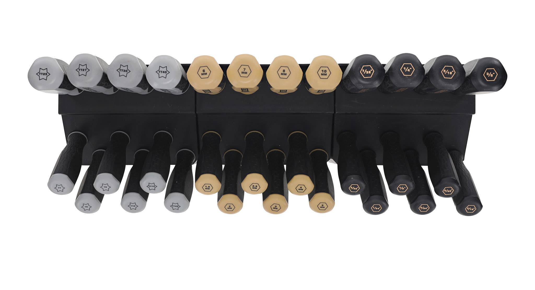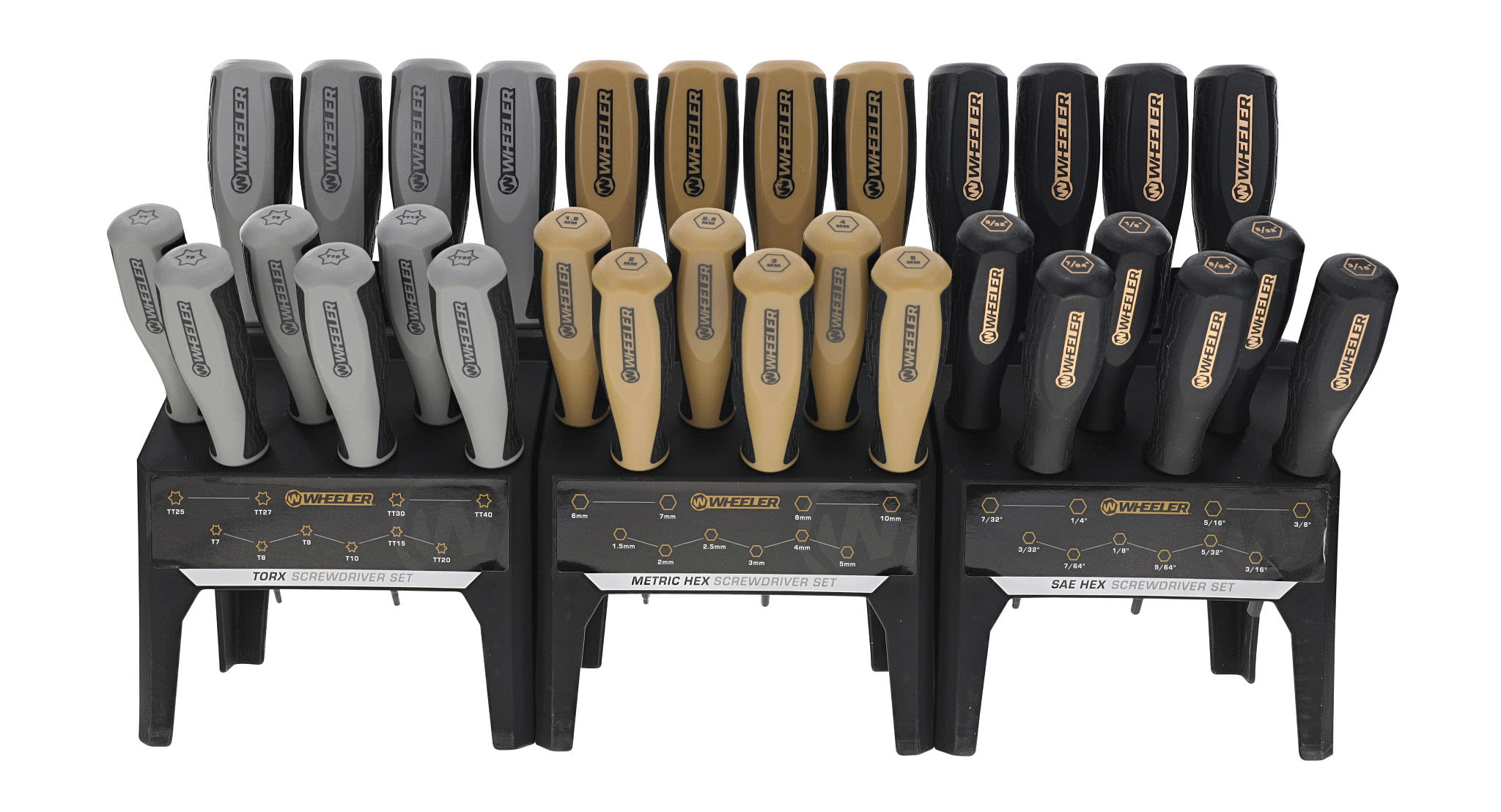 Experience unmatched convenience and organization in your workspace with the Wheeler® 30 Piece Hex/Torx Benchtop Screwdriver Set. Engineered to be an all-in-one tool assortment, this comprehensive collection contains 10 SAE Hex, 10 Metric Hex and 10 Torx screwdrivers to cover a wide range of common fasteners, guaranteeing you have the right tool for the job. Features include color-coded handles and markings offering quick identification of each screwdriver type and size, ensuring you spend less time searching for the right tool. Textured, rubber over-molded handles fit comfortably in the hand, increasing grip while reducing hand strain. The black phosphate-coated shafts protect against rust and corrosion, giving you peace of mind that your tools will be long-lasting and look great on your bench for years to come. The sturdy benchtop stand ensures that your tools stay organized, preventing tool loss and time spent looking for misplaced tools. The versatile 3-piece modular stand not only keeps the tools organized but also detaches for ultimate portability.