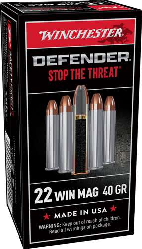Defender uses state-of-the-art threat stopping technology to provide the shooter with every possible advantage. The Defender rimfire cartridge is a 22 Winchester Magnum with a 45-grain jacketed hollow point bullet designed to deliver the ideal personal defense combination of optimum penetration and maximum projectile expansion for maximum energy transfer.