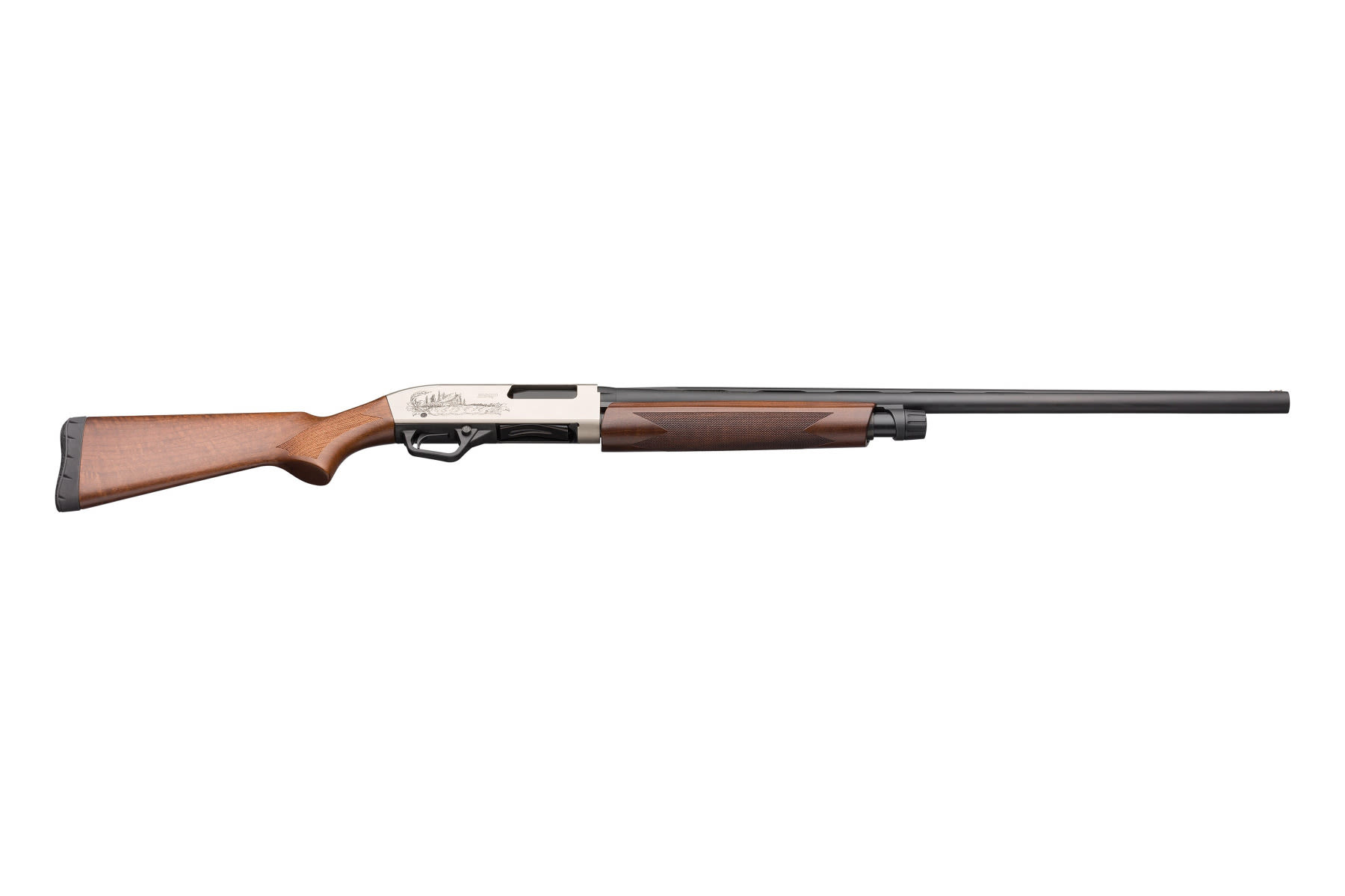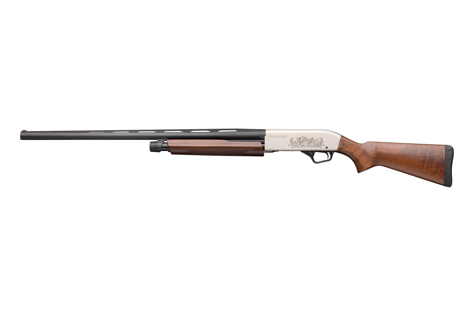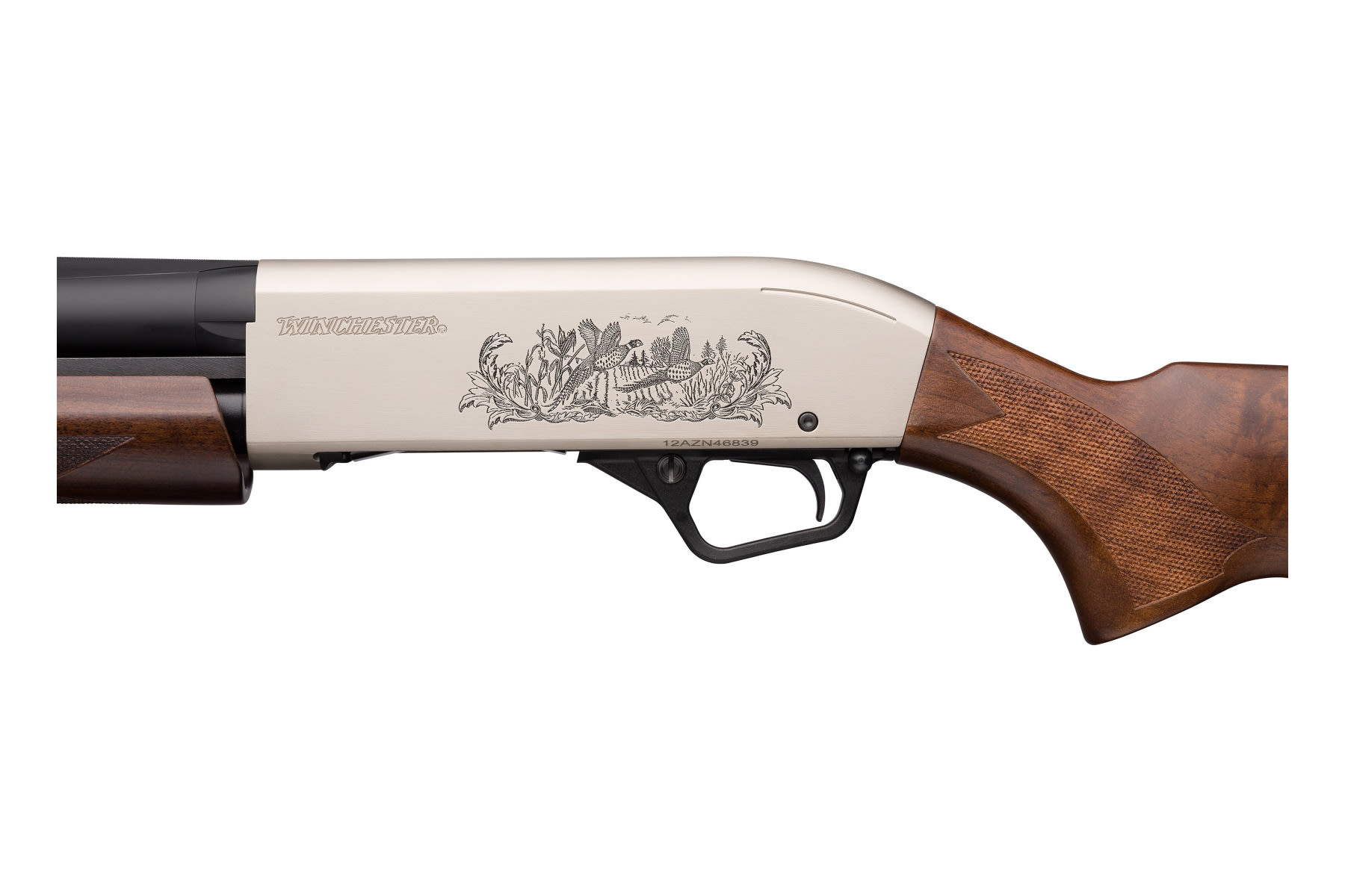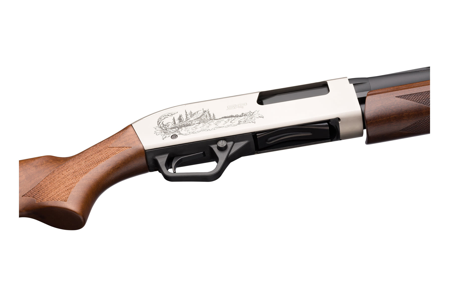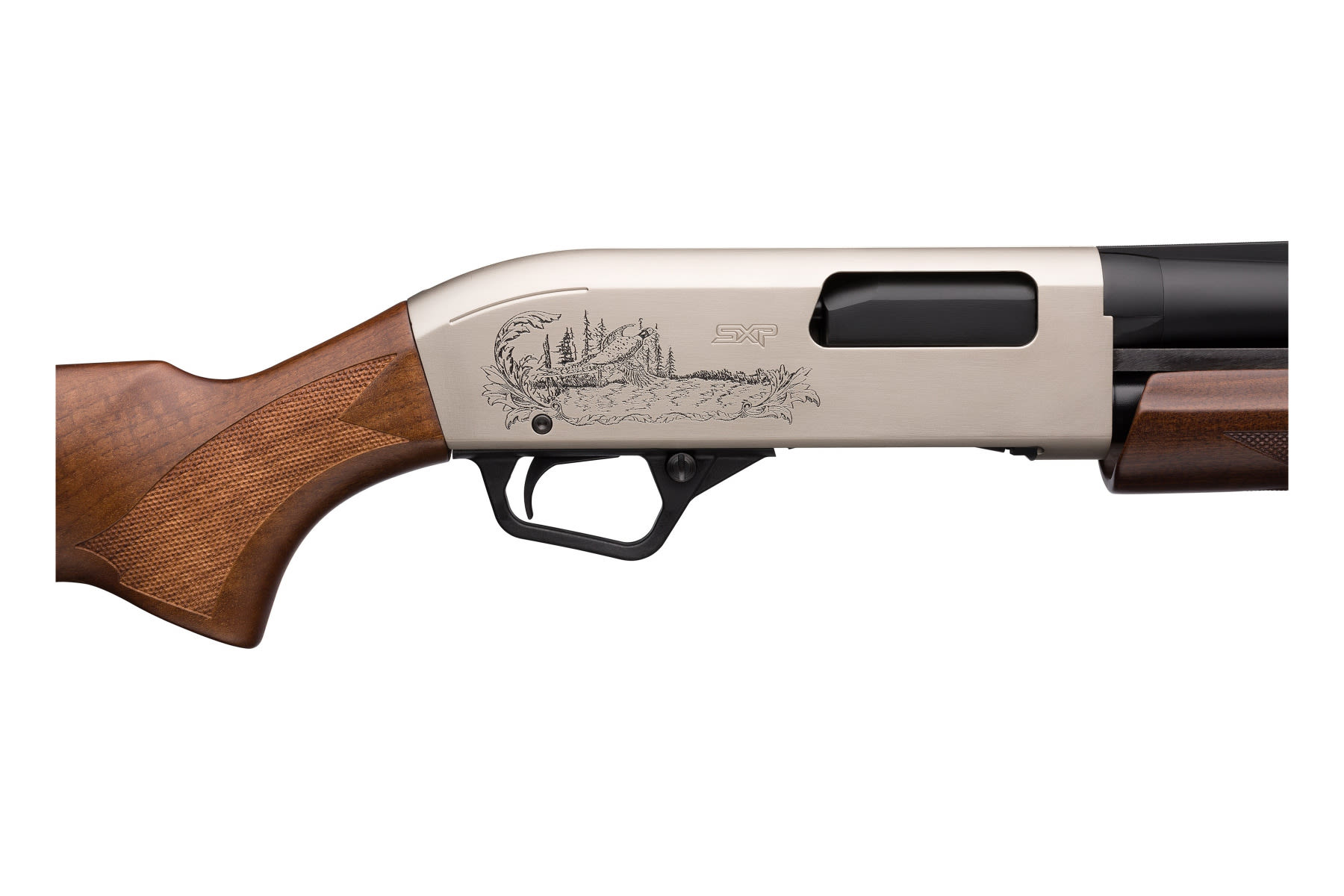 An heirloom SXP. Pump guns don't always get the embellishment they deserve. Back in the Winchester Model 12 days, it was common. Now you can get an SXP that you will love to show off and enjoy shooting -- and that you will keep in the family forever. 12 and 20 gauge. Nicely executed engraved upland scene on a durable matte nickel finished receiver. This SXP offers artistic flair with the contrasting nickel and walnut along with the blued barrel, magazine and black recoil pad.