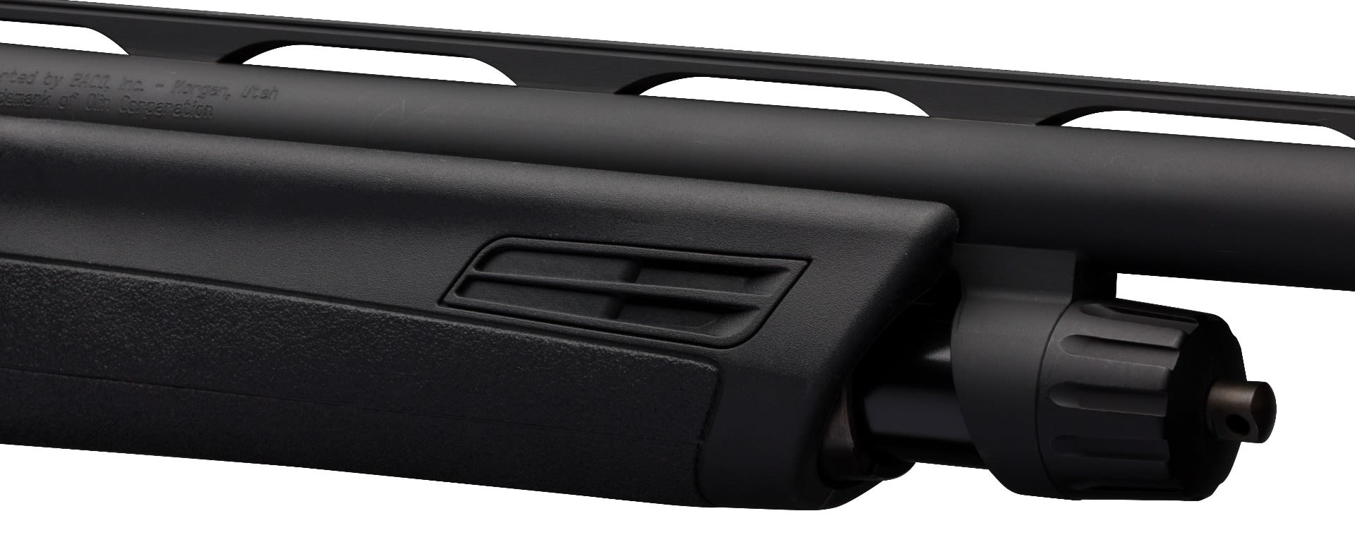 Black synthetic stock with textured gripping surfaces, back-bored barrel, Invector-Plus choke system, hard chrome-plated chamber and bore, black chrome bolt.