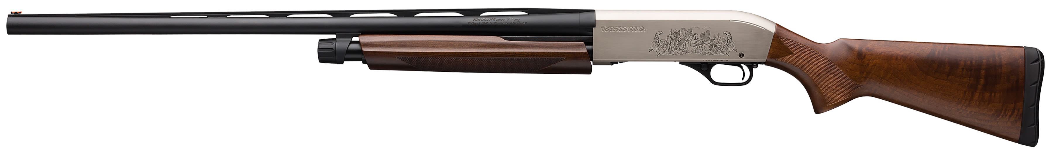 Pump guns don't always get the embellishment they deserve. Back in the Winchester Model 12 days, it was common. Now you can get an SXP that you will love to show off and enjoy shooting and that you will keep in the family forever. 12 and 20 gauge. Nicely executed engraved upland scene on a durable matte nickel finished receiver. This SXP offers artistic flair with the contrasting nickel and walnut along with the blued barrel, magazine and black recoil pad.