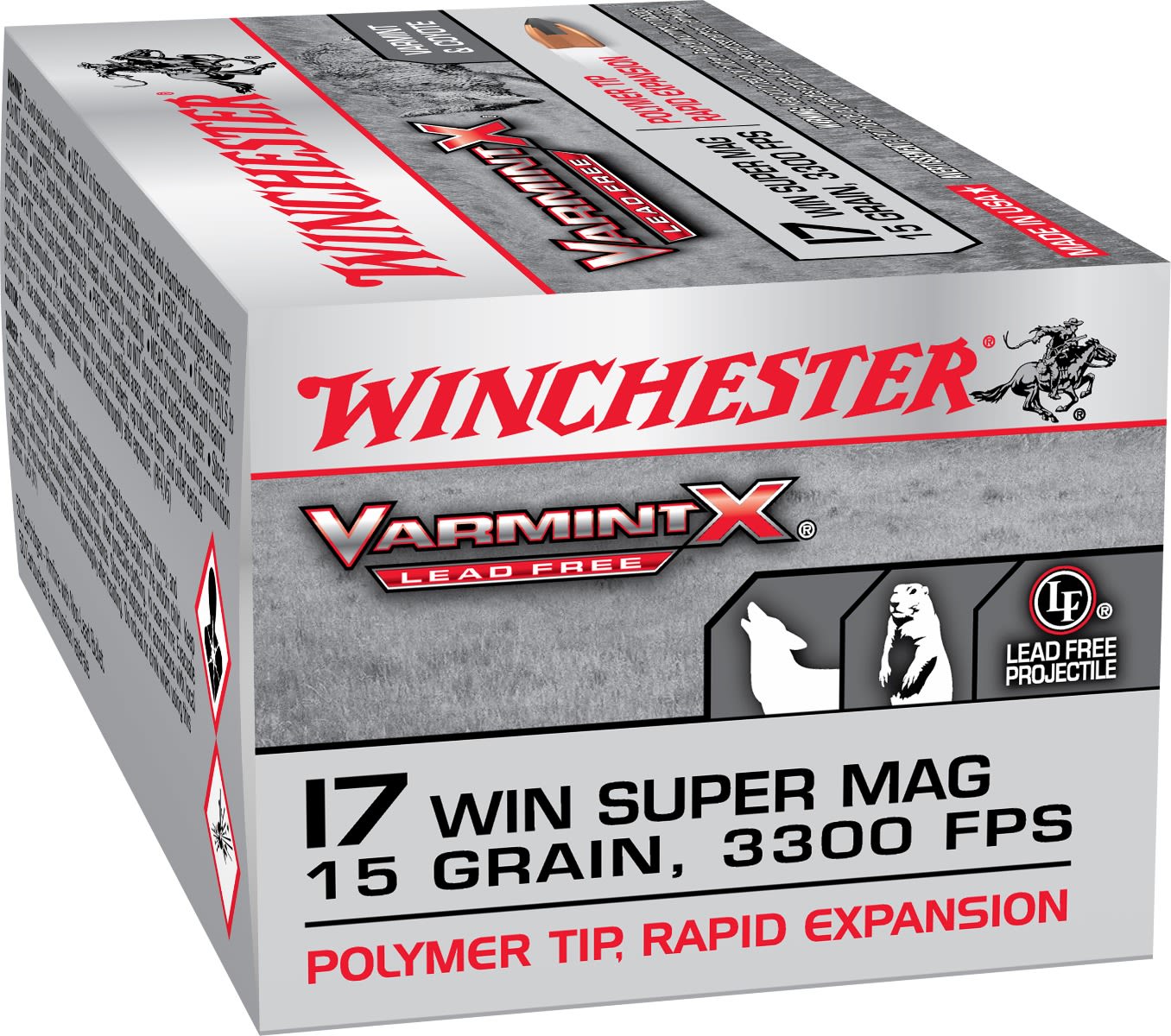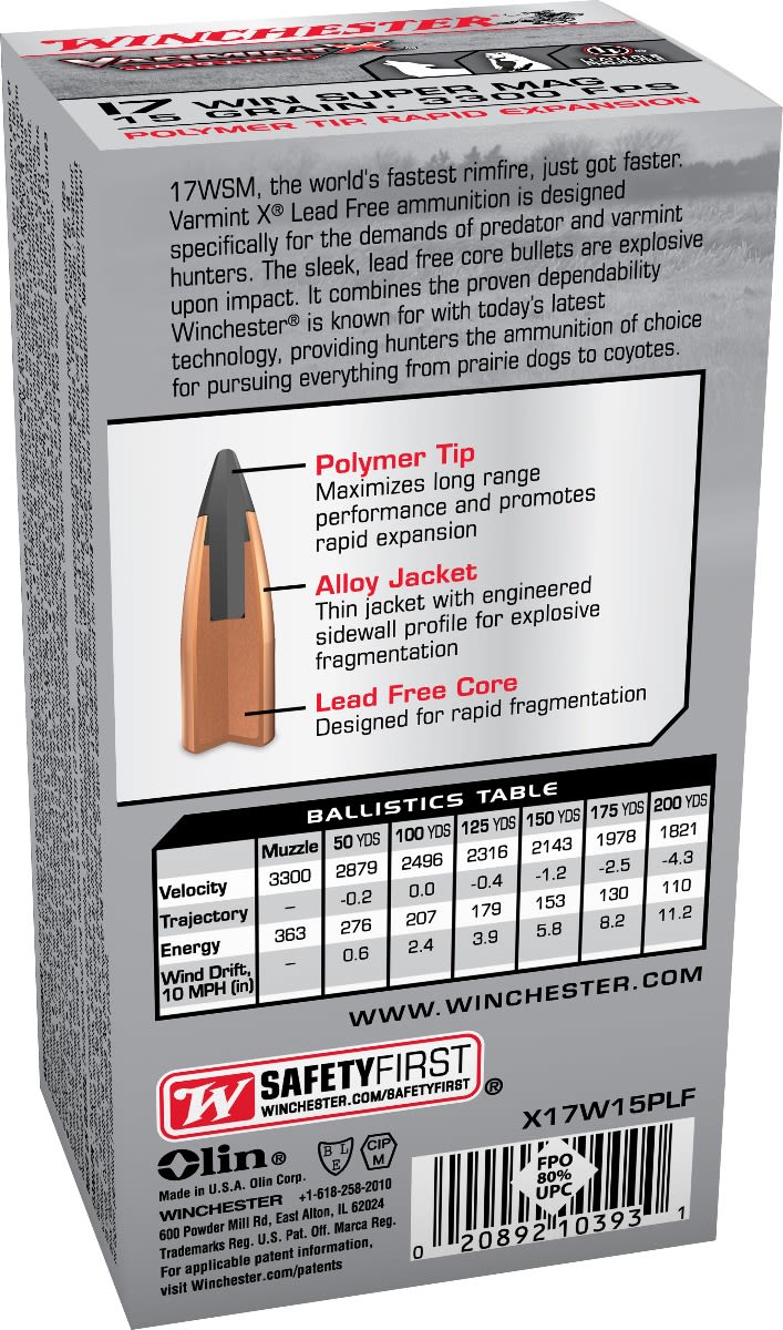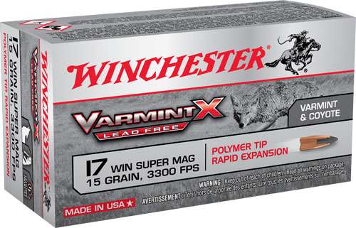 17WSM, the world's fastest rimfire, just got faster. Varmint XP Lead Free ammunition is designed specifically for the demands of predator and varmint hunters. The sleek, lead free core bullets are explosive upon impact. It combines the proven dependability Winchester is known for with today's latest technology, providing hunters the ammunition of choice for pursuing everything from prairie dogs to coyotes.