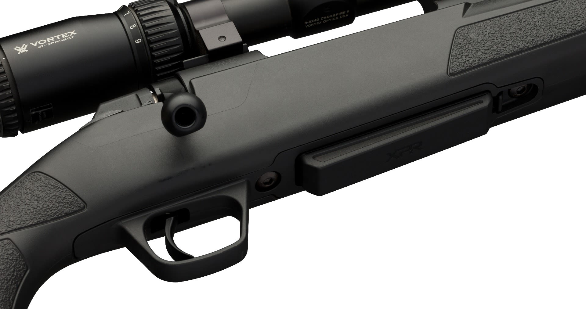 Tough and accurate. If you're looking for a rifle that will stand up to the abuse you put yourself through in the field, the XPR is the rifle for you. The advanced polymer stock is built for superior grip in wet conditions and will stand up to the scratches and bumps you're bound to encounter on the stalk or on the walk to the stand. The matte blued finish is tough and non-reflective. The detachable box magazine is a built in feature that is typically an expensive after-market addition, allowing you to keep extra shells in a spare mag instead of jingling loose in your pocket.